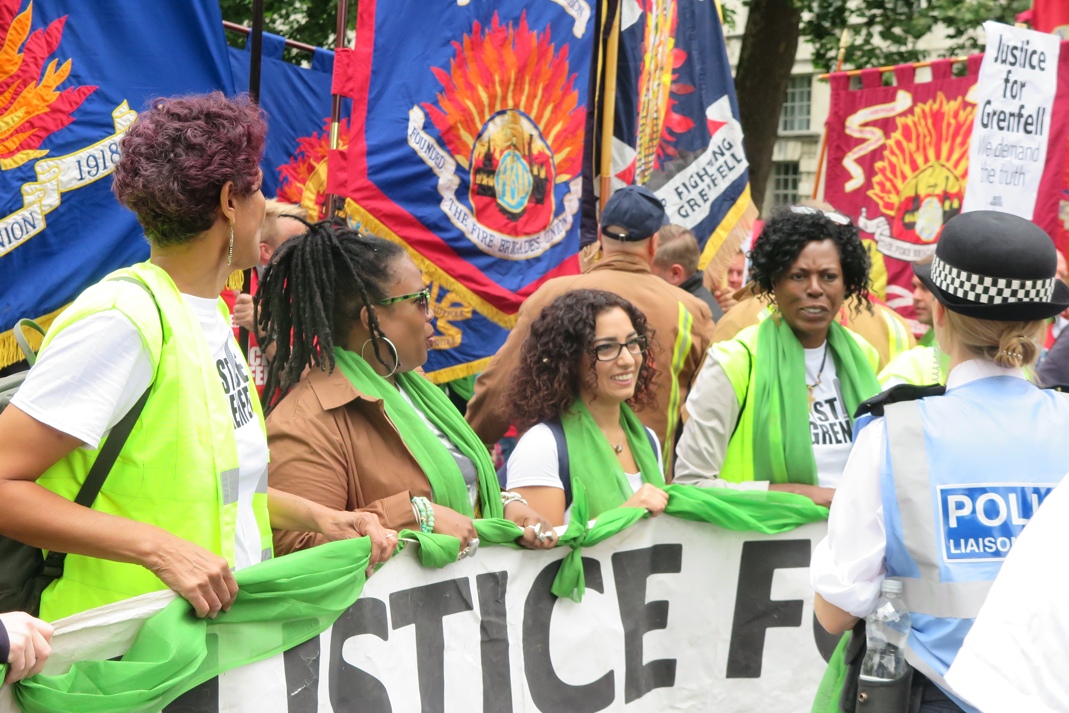 Demo an der Downing street. Gründungsitgliederinnen von Justice 4 Grenfell erste links Moyra Samuels, zweite von links Judy Bolton erste von rechts Yvette Williams IMG_1100